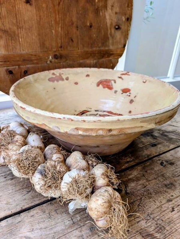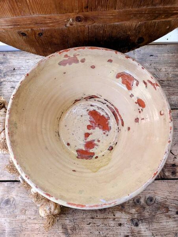 Daarnaast betreft het een grote Franse grésalle afroom schaal van terra cotta met zichtbare gebruikssporen aan de binnenkant.