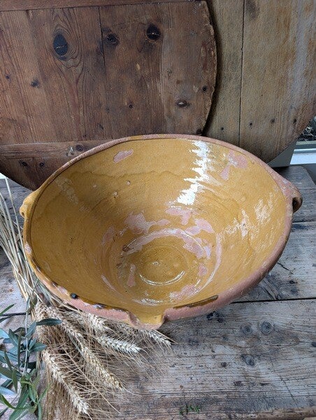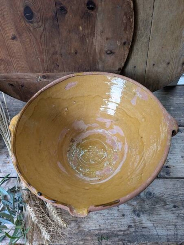Deze royale tian, traditioneel gebruikt in Zuid-Frankrijk voor het bereiden van ovengerechten of het mengen van deeg, is een prachtig voorbeeld van Provençaals aardewerk. De warme okergele glazuurlaag, charmante oren en het forse formaat maken dit stuk tot een opvallende blikvanger—zowel functioneel als decoratief in een landelijke keuken of brocante setting.