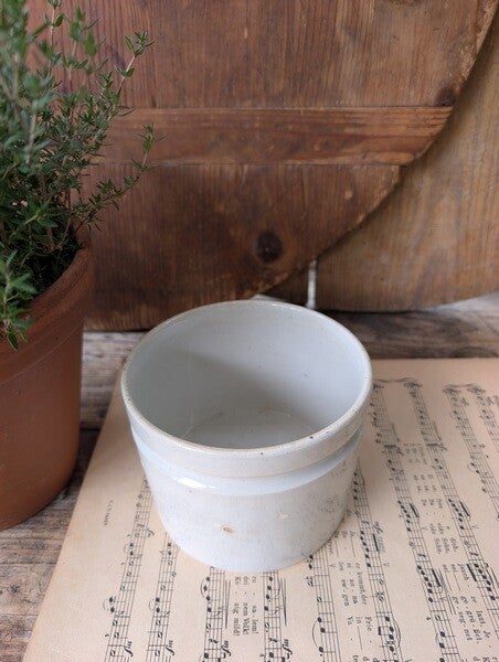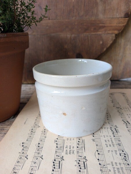 Oude Franse zalfpot van cremekleurig keramiek, zonder stempel. Dit type pot werd vroeger gebruikt voor het bewaren van zalf en crèmes.