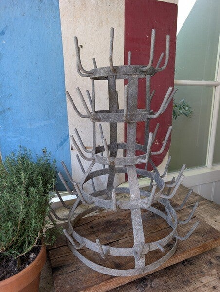 Een authentiek voorbeeld van Franse landelijkheid: dit metalen pinnenrek werd oorspronkelijk gebruikt voor het drogen van gewassen wijnflessen in huishoudens en wijnboerderijen. Het lichtgrijze metaal geeft het geheel een frisse, maar doorleefde uitstraling. Praktisch in gebruik én een opvallend decoratief element dat Franse charme uitstraalt.