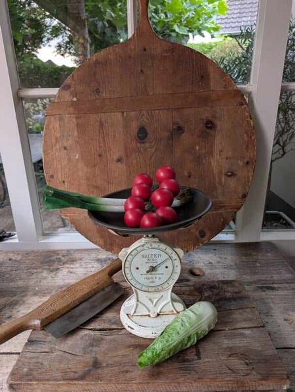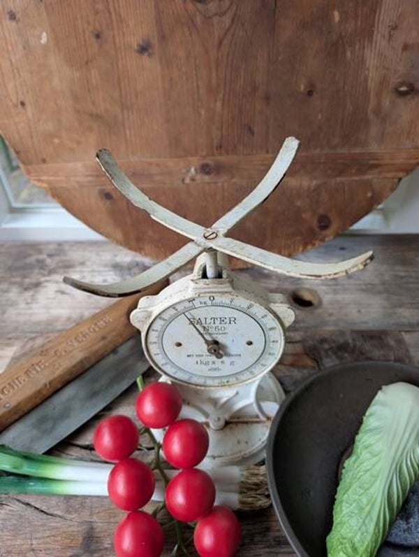 Oude metalen Engelse weegschaal in witte uitvoering. Voorzien van het originele Salter-logo in het metaal. De weegschaal is geschikt voor gewichten tot 1 kilo en wordt vaak gebruikt als decoratief object.
