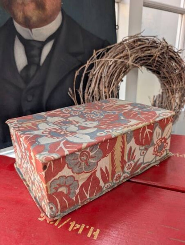 Franse stoffen doos, bekleed met decoratieve stof en voorzien van een karaktervolle uitstraling. Altijd prachtig als opberger, maar vooral mooi als decoratief object — zeker in combinatie met andere stoffen dozen.