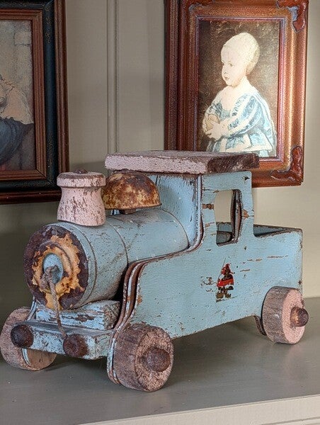 Prachtig verouderd met verfslijtageplekken die zorgen voor een authentiek vintage patina. Licht gewaxt om de afwerking te behouden. Niet langer geschikt als speelgoed, maar een charmant decoratief object voor verzamelaars — een sfeervol pronkstuk in een stijlvol interieur of winkel.