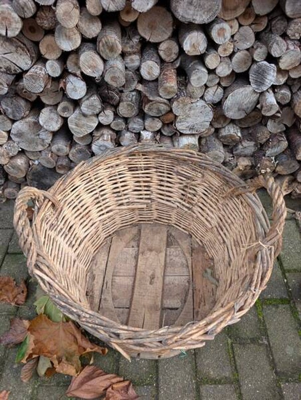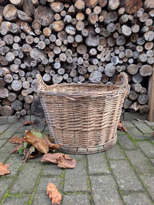 Grote, robuuste mand met houten bodem — perfect als decoratieve basis voor een kerstboom of als opberger voor haardhout.