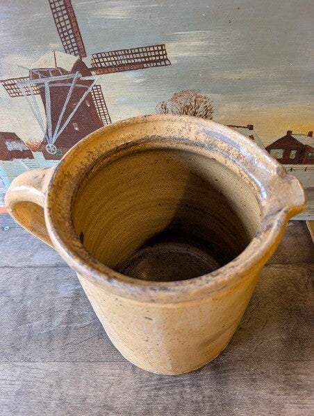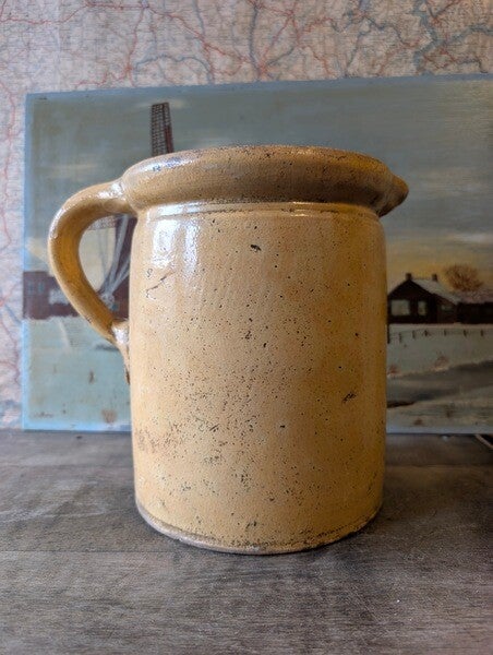 Oude Franse melkkan – zachtgeel aardewerk