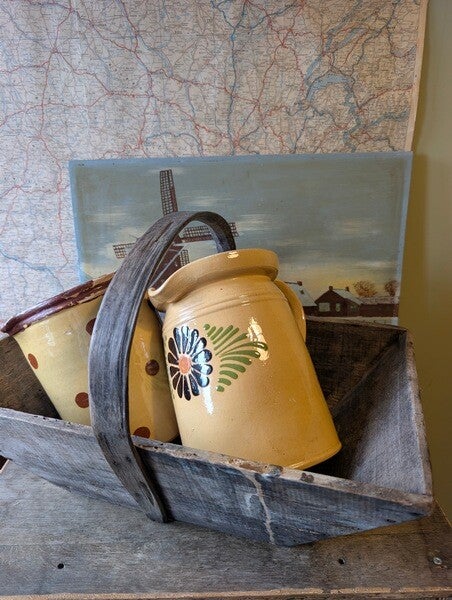 Antieke Elzasser melkkan van geglazuurd aardewerk met een mooi bloemmotief. Een karakteristiek voorbeeld van traditioneel vakmanschap, uitgevoerd in warme tinten en met een tijdloze uitstraling.