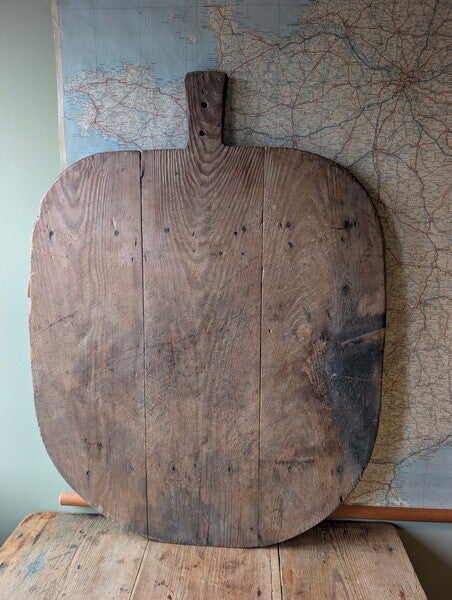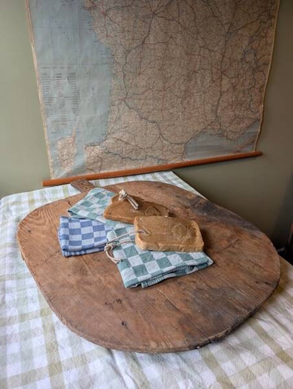 Karakteristieke oude broodplank met een rustieke vorm en een prachtige, doorleefde patina. Het hout heeft een warme uitstraling en toont het authentieke gebruik van vroeger, zonder dat er sprake is van houtworm.